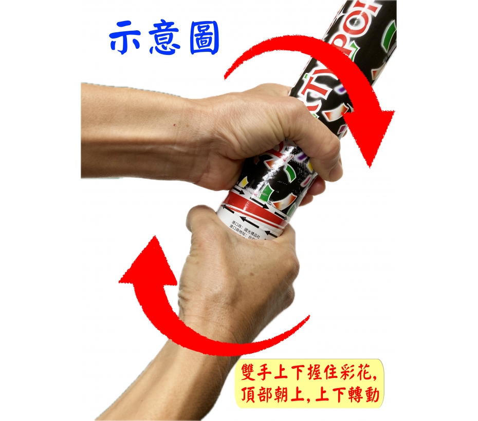 新型無火藥、無污染產品,轉動後壓縮氣體將內裝五彩繽紛之短條彩帶推向上空,並產生聲響,安全讓各類節慶、宴會、典禮及慶典活動推向高潮。