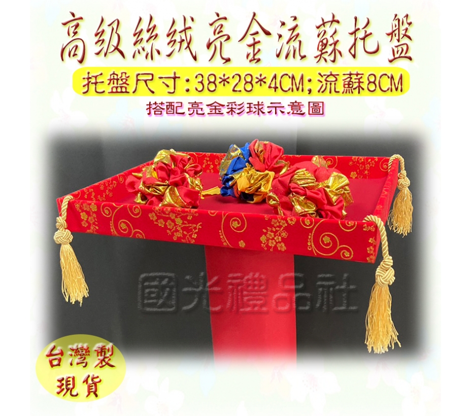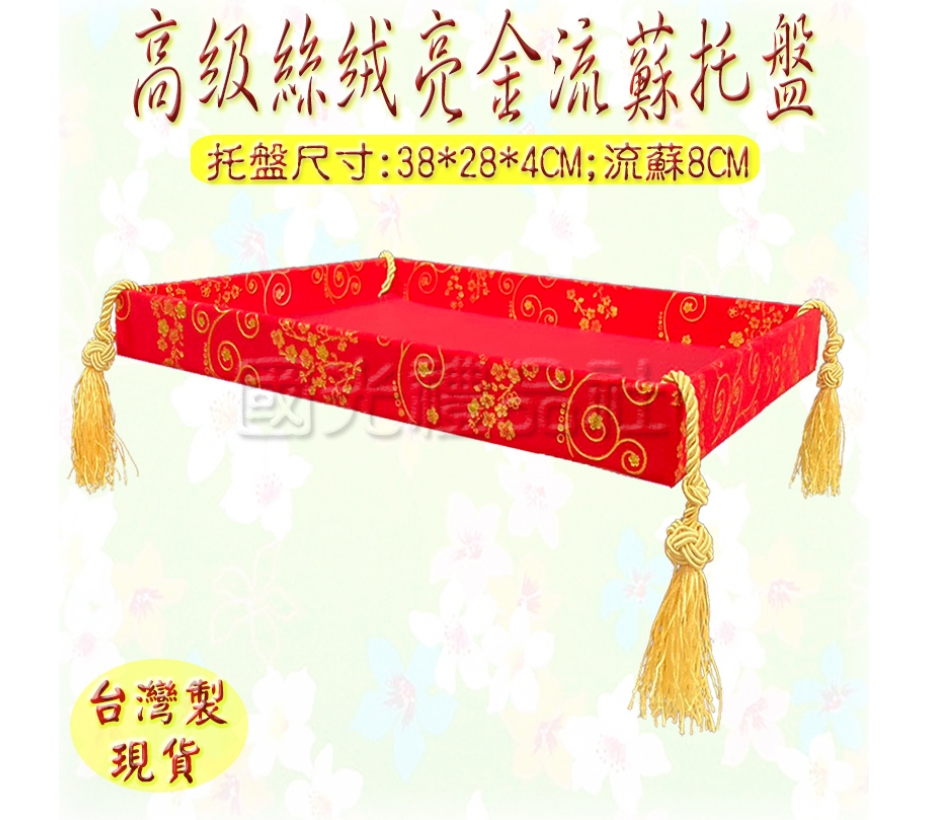 說明: 產地:台灣 顏色:紅色,照片顏色實際商品略有差異,實際以商品為主。 尺寸:約38*28*4CM,流蘇長度約8CM 材質:封面使用高級絲絨包邊,柔棉絨感,並外加燙金紋路加工,厚實有質感。 產品說明: 1.喜慶、結婚、開幕、頒獎的好幫手,除了頒獎/剪彩,亦可使用於婚禮儀式,裝大小聘,更顯亮點。 2.可承載5公斤物品。 3.此商品為手工製作,會有些許邊有布鬚,純屬自然現象,如不介意再下標,若收到貨有布鬚只需用剪刀修去即可,勿用手去撕扯它,商品若撕扯導致損毀恕不接受退換哦!